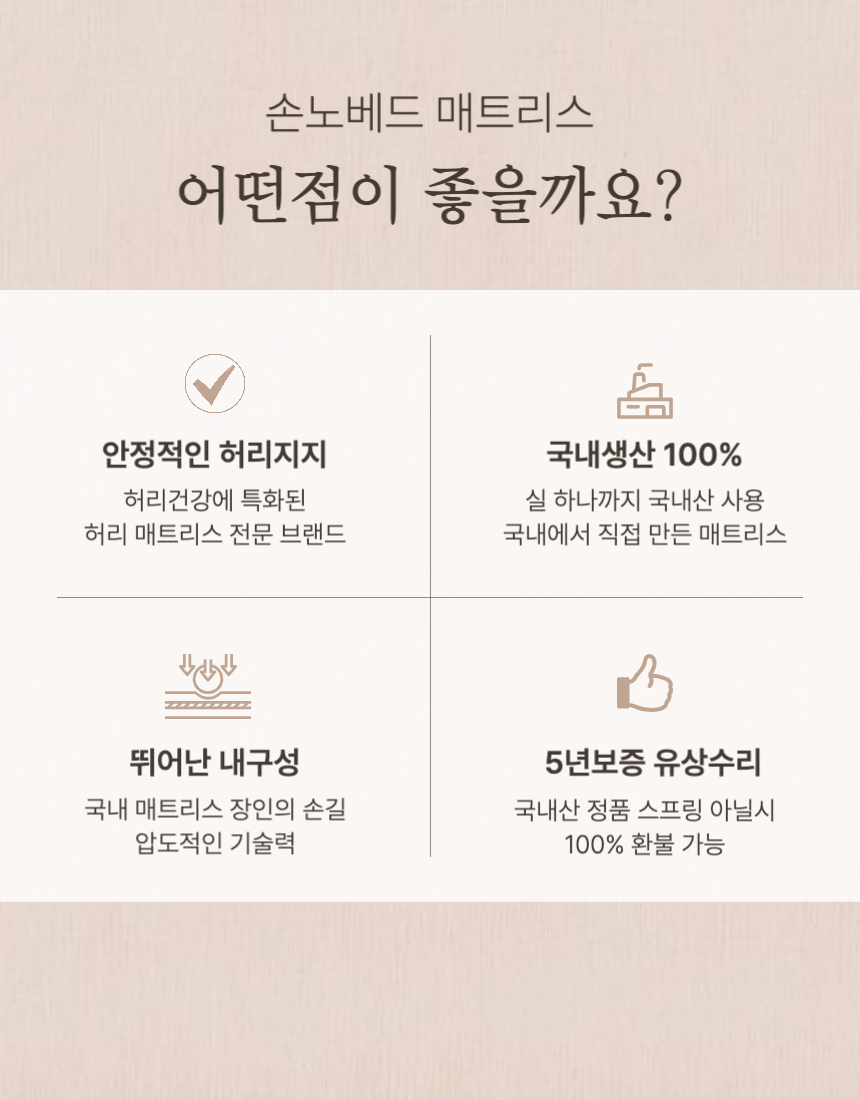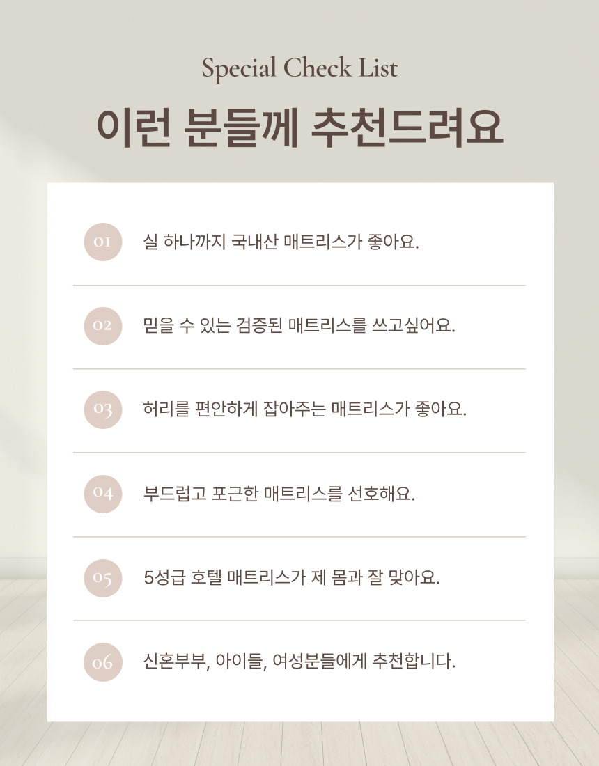 이런 사람에게 추천해요 !✔ 꺼지는 매트리스는 싫은 분✔ 소프트/미디엄하드 선택가능✔ 신혼부부, 2인 이상 사용하실 분