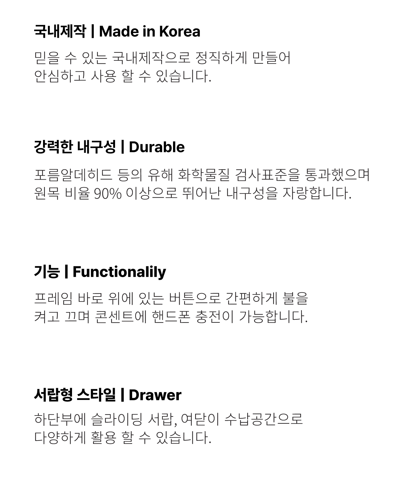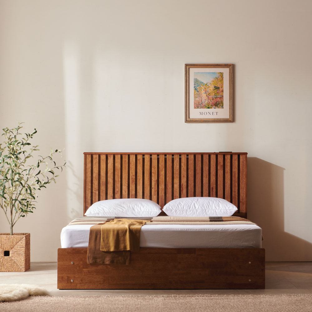 고무나무 침대 프레임 '우드'는 수납 가능한 서랍이 있어 공간 활용에 용이하고, 머리맡에 있는 콘센트는 침대 위에서 핸드폰, 노트북 충전을 편리하게 할 수 있습니다. 또한, 머리맡에 은은한 조명은 아늑한 침실 분위기를 더해줍니다.