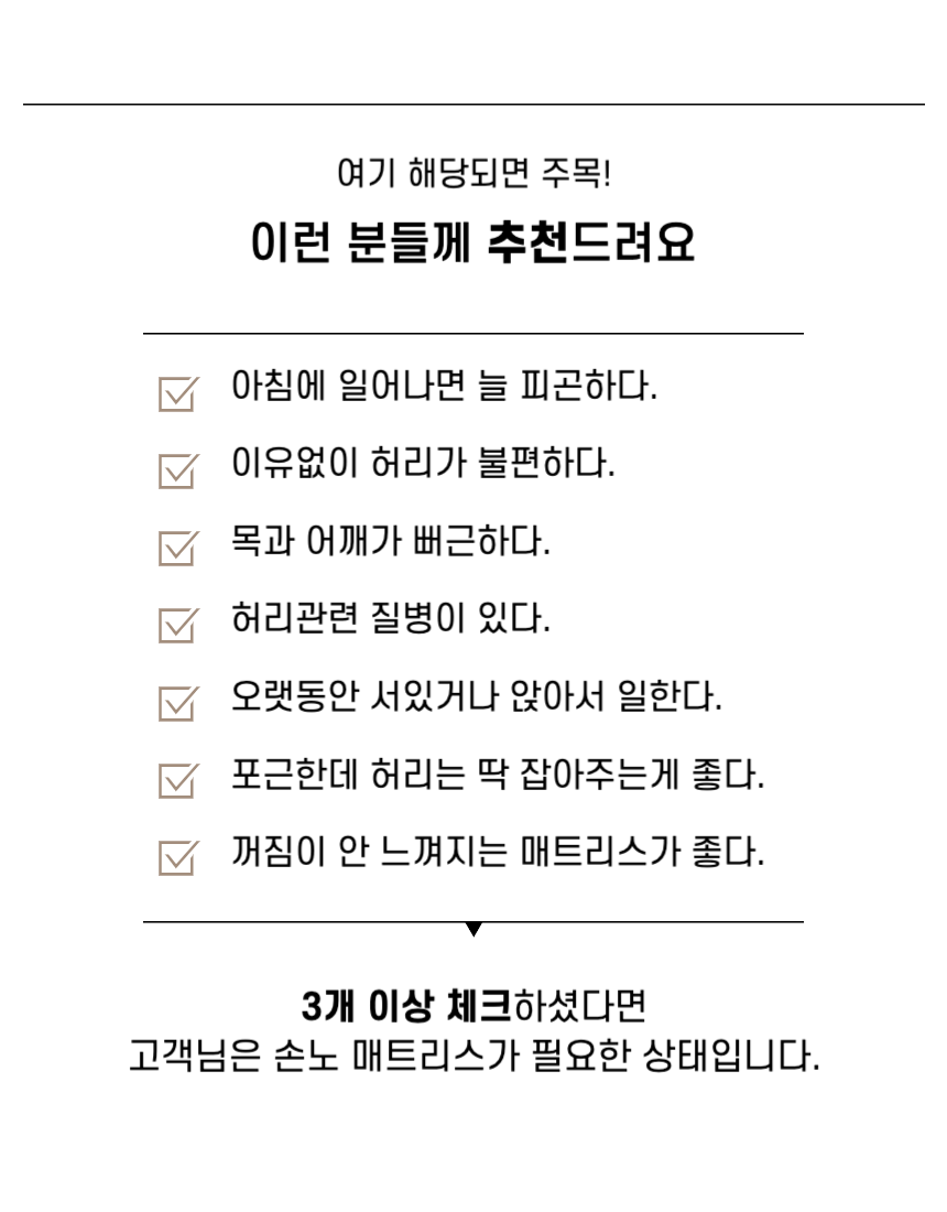 이런 사람에게 추천해요 !✔ 꺼지는 매트리스는 싫은 분✔ 허리를 탄탄하게 잡아주는게 좋은 분✔ 단단한 매트리스를 좋아하는 분